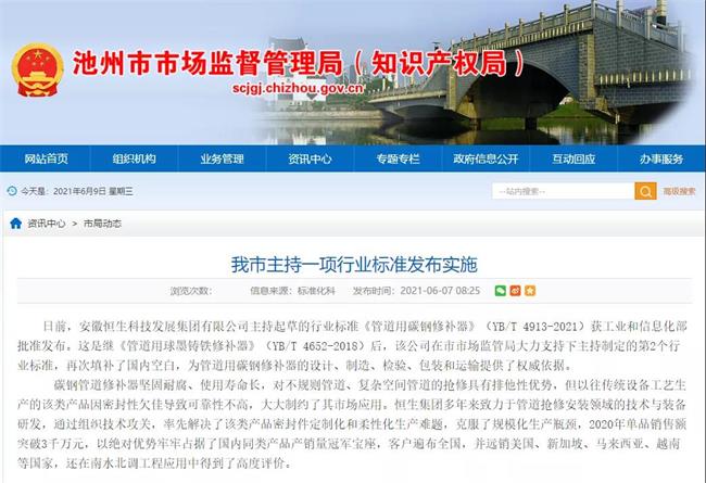 恒生集團多年來致力于管道搶修安裝領域的技術與裝備研發(fā),并已發(fā)展成為集微電子、機械、化工及彈性體密封件制造等為一體,擁有多家控股子公司的多元化、現(xiàn)代化企業(yè)。恒生集團是“安徽省高新技術企業(yè)”和“國家知識產(chǎn)權(quán)優(yōu)勢企業(yè)”,是多種材料標準的主要起草單位,2015年國家工信部批準了由恒生集團主持起草《管道用球墨鑄鐵修補器》的國家行業(yè)標準,該標準將于2018年9月開始實施,這對引導國內(nèi)管道修補器行業(yè)的發(fā)展有著積極而深遠的意義。